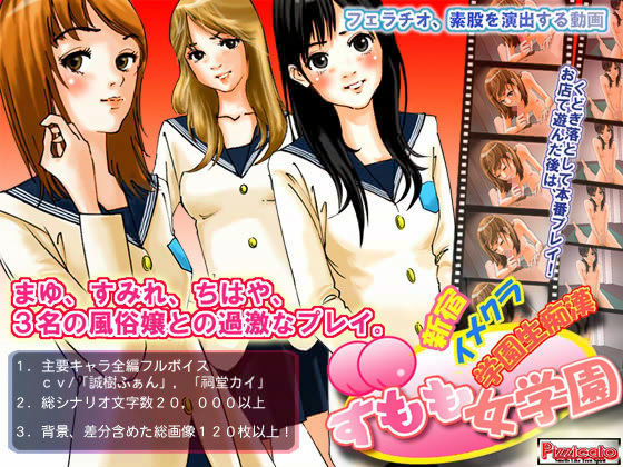 ■形式 ADVノベル 画像サイズ 800*600 ■内容 ・プレイヤー視点で進むADVノベルゲーム。 ・3名の女生徒をプロフィールを参照し選択。 1.おっとりタイプのまゆ。 2.妹タイプのちはや。 3.活発なモデルタイプのすみれ。 ・イメクラ「すもも女学園」の女生徒達との 濃密プレイを擬似体験。 プレイ内容により仲良くなって、店外デートで 本番プレイを目指そう。 ■ポイント ・プレイ内容はフェラ、素股プレイで、 射精方法を口内発射、ぶっかけで選択。 ■CG&動画演出 ・基本25枚程度、背景・差分含めた総枚数120枚以上 ・(嬢のフェラ、素股プレイ)*3名分 計6シーンの動画演出 ・主人公、女性3名フルボイス ・シナリオ文字数 20000文字以上