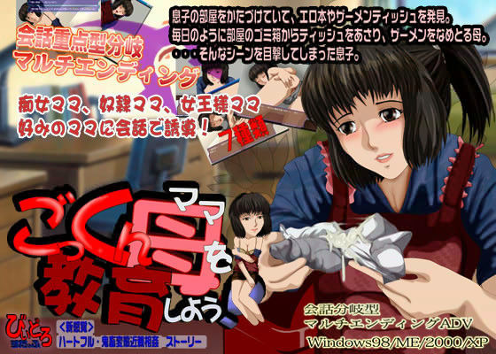 息子の部屋をかたづけていて、エロ本やザーメンティッシュを発見。 それ以来毎日のように部屋のゴミ箱からティッシュをあさり、ザーメンをなめとる母。 ………そんなシーンを目撃してしまった息子。 押し入れに隠れて見てしまったものは……。 ゴミ箱からザーメンを拭き取ったティッシュをうれしそうに取り出す母親だった。 そのザーメンティッシュで自慰を始める母……。 「お母さんね……ちょっとヘンだね?……あなたが好きで好きで……たまらないの。」 そんな場面に、そんな母にあなたはなんという言葉をかけますか? ★会話重点型分岐シナリオ 7種類のマルチエンディングSS。 痴女ママ、奴●ママ、女王様ママ、スカトロママ………。 好みのママに会話で誘導。 ●新感覚 ハートフル・鬼畜変態近親相姦 ほのぼのタッチでありながら、その内容はハード! ●女性キャラ・フルボイス 癒し系美人ママをボイス収録 変貌した変態ママを妖しく演出!