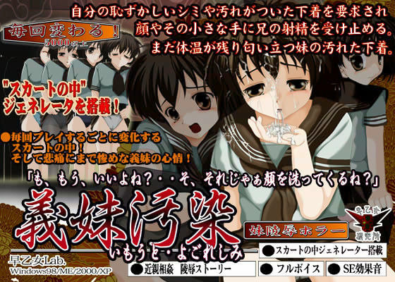 義妹汚染 GAME X Facebook はてブ Pocket LINE コピー 2025.11.13<PR>発売日2008-05-31 09:59:08ジャンル音声付き 辱め 近親相姦 スカトロ 顔射 アドベンチャー 男性向け メーカー早乙女研究所 品番d_017893価格¥715 まだ体温が残り匂い立つ妹の汚れた下着。 自分の恥ずかしいシミや汚れがついた下着を要求され、顔やその小さな手に兄の射精を受け止める。 寝たきりの兄のオナニーの手助けをするいたいけな妹。 今日も兄に言われるがままどろどろと吐き出る射精を顔で受け止める。 「も、もう、いいよね?……そ、それじゃぁ顔を洗ってくるね?」 お母さんの幸せが壊れないように私は我慢します。 貧困な生活を送ってきた母子家庭。 そんな母に思ってもいない良縁の再婚話。 幸せそうな母をうれしそうに見つめる娘。 しかし、再婚相手には男の子が一人いた。そしてその息子は異常性格者だった!? お○ない娘はその義兄による鬼畜な扱いに日々耐えていく。 幸せそうな母のために……。 ●義妹が学校から帰ってきたばかりの下着の裏地……どうなっているか気になりますか? 体育で汗ばんだり、トイレを我慢したり、女の子の日だったり……… さまざまな下着についた痕跡は今日一日少女に起きたことを全て物語る。 ●毎回プレイするごとに変化するスカートの中!そして悲痛で惨めな義妹の心情! ストーリー中に変化する5000パターンを超える様々な下着と恥ずかしい染み、そして恥辱セリフの組み合わせ! ○スカトロ物可変SS ○女性キャラフルボイス ・全体的にホラー仕立てになっています。詳細はこちら義妹汚染 1枚目義妹汚染 2枚目詳細はこちら