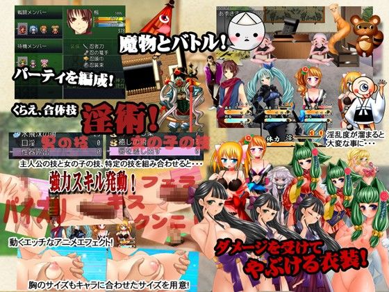 「ver2.02バージョンアップいたしました!」 サボテンが本気で挑む、エロRPG作品!! 世界に蔓延る魔物を退治する為、立ち上がる主人公。 主人公にベタ惚れな姉妹と一緒に困っている人達を助けながら、 魔物の発生源を調査するクエスト攻略型RPG!! 【システム】 クエスト受注: 街には様々な理由で困っている人がいます。 先輩忍者の「夜叉丸」から情報を得て、 困っている人達を助けてあげましょう! また、依頼をお願いしてくる人と仲良くなれる事があります。 仲良くなったお礼にムフフな出来事があるかも……!? 淫術システム: 由緒正しき忍者の家系の生まれの主人公は、秘伝の術「淫術」を父から教わります。 その淫術とは「女の子にHな事をすると強くなれる」術だったのです! 「淫術」を使用する為には、女の子の「性欲」が溜まってないと使用することができません。 あらゆる手段で「性欲」を溜め、強くなる為にエッチな修行をしよう! しかし淫術ばかり使っていると、女の子が「淫乱」になってしまい、 戦闘に集中できなくなってしまいます。 上手く淫術を駆使し、主人公を最強の忍者に育てあげて下さい! ツクールの限界に挑戦!? こだわりぬいた戦闘システム: 今回は戦闘画面に「淫力」と言うメーターを付けました! これは淫術を使用する為に必要な数値で、 メーターを溜めると戦闘中に「淫術」が使用可能となります。 ※戦闘中に淫術を使用すると「アニメーションカットイン」が挿入されます! また、今作では戦闘中にも女の子が表示されます。 ダメージを受けると女の子の衣装がドンドン破れるなど、 飽きる事無く戦闘が楽しめます! ※女の子がバッドステータス「淫乱」になってしまうと……?? 総CG数55枚、差分含め300枚以上の大ボリューム!! サボテンお決まりアニメーション入り!! 女の子は音声入り! もちろん音声のon/offは切り替えが可能! ※音声の切り替えはゲーム中いつでも変更が可能です。 CGモード・回想モードもバッチリ完備! メッセージスキップやメッセージの非表示やログの表示など、 アドベンチャーパートにも対応しております!! 戦闘はハイスピードバトルによる「ストレスフリー」な戦闘を目指します! エロ以外も手を抜きません!(皆さんはシノクエで抜いてください! 歯ごたえのある調整され尽くしたバトルバランス! そして全登場モンスターはサボテンオリジナル! サボモン! どこでもパーティ編成可能、お気に入りメンバーで立ち向かえ! 日本を舞台にした現代風ステージ! 学園、研究所、森……日本各地を駆け回り、謎を解こう! フィールドは選択式で、街から街へサクサク移動! セーブ箇所は安心の16箇所! ※本作は「RPGツクールVX」製ですが、ランタイムなどは一切必要ありません。