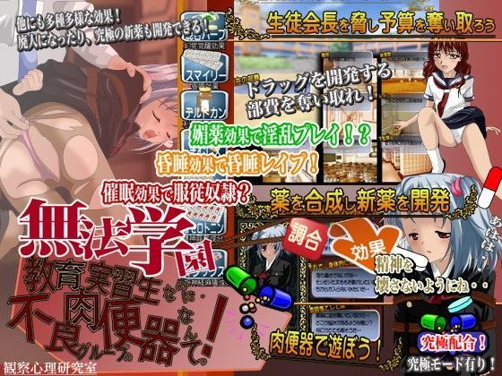 斬新なアイデアでまったく新しい効果をもつドラッグを作りだそう! 無法地帯と化した学園で恐喝やドラッグ暴行! やりたい放題! <無法学園を暴力支配> 無法学園、鋼の鉄則! 暴力! 狙った獲物をドラッグ漬けにするため学園生活を開始! 学園を暴力で支配しドラッグ開発の予算を作り出せ! <薬を合成し新薬を開発> 自由にオリジナルの新薬を調合し憧れの天才少女をビッチな肉便器にする! 出来上がる●物は命令に服従する催●薬? すぐに意識がなくなり記憶すらも奪う睡眠薬?変態女に変貌させる究極媚薬? それとも…。 斬新なアイデアでまったく新しい効果をもつドラッグを作りだそう! 催●効果を強めて服従奴●? 昏●効果で眠らせて恥ずかしい所を写真撮影! 媚薬を強めて自分から求める変態女? さぁ、作り上げたビッチな肉便器で遊ぼう! ○ポイント1 ●物の複数合成も単品投与も自由に選択可能。 単一の効果をねらってもよし、未知なる効果を期待するのもよし! ただし極端な調合は廃人にしてしまう危険性が…。 投与した様子を観察することで彼女が徐々に変化していく様を楽しもう! ○ポイント2 究極の●物モード有り 最凶の効果をもつ新薬を開発し究極モードに突入する事ができるか! ○ポイント3 変態キモデブと不良グループ達により誰もいない理科準備室に一人呼び出され キモデブを含む不良グループを嫌悪しつつもドラッグによる魔の効果に逆らえない屈辱!