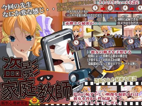 変態家庭教師が教え子の部屋に仕掛けた沢山の盗撮カメラ。 沢山の恥ずかしい映像を撮影することが出来れば彼女を脅迫し性奴●とするパラダイスモードに突入!! 教え子の少女を性欲の対象とする変態家庭教師。 こっそりと少女の飲み物に自分のザーメンを入れたりする悪戯に飽き、禁断の計画を実行する。 教え子が部屋にいない間に盗撮カメラを仕掛けるのだ。 仕掛けた場所は全部で4カ所。記録機器は一台。 どんな秘密を盗撮できるかはタイムスケジュール次第! 沢山の恥ずかしい映像を盗撮し脅迫材料とすることが出来れば少女を自分専用の性奴●とすることが出来る。 このパラダイスモードに突入する事が出来るか! ○ポイント1 同時に記録できるカメラは1台だけ。 時間によって自由に行動する少女の動きを予想することが出来るかがゲームの鍵。 沢山の痴態を撮影し夢のパラダイスモード突入なるか!? ○ポイント2 あの子がまさかこんな事まで・・ 油断した日常や・・濃厚なオナニーも・・ カメラをドキドキのパンチラを狙う机の下などにセット。 もはや彼女のプライベートは無い。 ○作品詳細はサンプルをご覧ください。 本作品はボイス収録とおまけ要素がありません。 予めご了承ください。