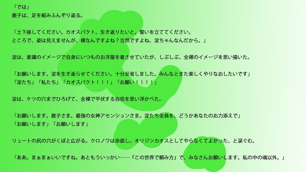 gyss0866 【長編小説】淀ちゃん墓場の物語【ジナシス26】 ≪ヒロカワミズキのオリジナル看板娘「ジナンドロモーフ・シスターズ」シリーズ/since2011≫ 通常のノベルシリーズよりも大規模なボリュームで完成!!!『ジナシス26』2026年シリーズのストーリー長編!!! 淀が、ベルガモットが、そしてメイトガードが・・・・・・それぞれの物語にひとつの結末が訪れる、大きく揺れ動くストーリーの総本山!!! 〜あらすじ〜 澄とまこもの人生と引き換えに、年齢を失い最終的に消滅してしまった淀。 彼女は、淀ちゃんたちの魂が流れ着く先…「淀ちゃん墓場」へと送られた。 そこは、夢の地獄。三途の川とも呼ばれる、死者の魂を癒す場所。 だが、それは、彼女たちを癒すものではない。死者の欲望を叶えるため、性的な強●執行をされ続ける、平行世界の淀ちゃんたち。 肉体もなく、「孕ませ」というゴールもなく、ただ、快楽のため体を酷使され続ける、女性にとっての最終地獄。 永い時のすえ、淀は悔い改め、自らの意志で生き返りたいと願う。 これは、生きることを諦めた不死が、みんなのもとへ戻るまでの、新しい旅路の物語――― ☆ジナシス2026で注目を浴びたキャラクターたちの、その後の物語が描かれる完結編!!! 「過去の作品でこんなことがあったけど、あれどうなったの……??」が語られる、新作ノベルシリーズ!!! ☆エロはありつつも、全体的には、ドラマチックな会話構成や、因縁の決着、そしてファンタジーバトル・アドベンチャー要素の強いノベライズ作品。 そしてなにより、「主人公・淀ちゃんの内面」に焦点があてられる、冒険活劇物語です。 ーーー 【商品仕様】 描き下ろしノベル小説+背景デジタルイラスト。 全編新作(SNS連載等なし)・オール書きおろし・オモテウラ表紙含め全29ページ。 【解像度】 [4K-UHD] 3840×2160 収録:JPG形式。 (パッケージなど、一部定型外のイラストがある場合がございます。) ーーー 制作 ヒロカワミズキ サークル名 スタジオ・ジナシスタ!! 〇シリーズはすべてここでしか買えませんので、サークルファン登録お願いします。(応援、励みになります) (c)Mizuki Hirokawa / STUDIO GYNASISTA!!