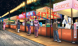 ノベルゲーム、アドベンチャーゲーム、コミックなどに使用できる著作権フリーの素材集です。 ピクセルサイズは640×480ドット、800×600ドット、1280×960ドットの3サイズです。ファイル形式は24bitのBMPファイルです。 ■収録CGは以下の1枚です。夜店時間差分(夕方、夜照明あり)はデフォルトで入れてあります。夜照明なしは必要性がなさそうなので作りませんでした。今回はモブキャラを作りました。夜店なのに無人なのはあまりに不自然かと思いましたので・・・。モブなので1影までしか塗っていません。作りも雑です。PNGデータと線画と彩色レイヤーを分けたPSDデータも入れておきました。サイズは縦方向が800ピクセル位です。自由に加工して他背景に使ってもらっても構いません。使い道があればですが・・・(^^;